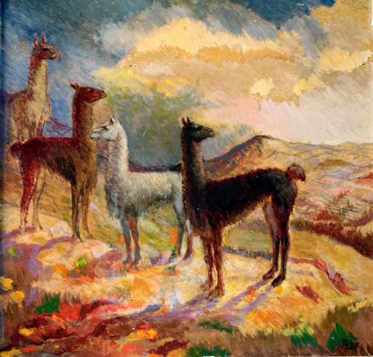 José Félix Cárdenas Castro termina su exilio en Francia en 1939. A su regreso a Perú, justo antes de la guerra, se encuentra solo en Lima, sin sus hijos que se quedan en Francia con su madre [20] (fig. 11). Confió en 1945, por acta notarial, el cargo a su hermano Juan Manuel. En 1946, cuatro de sus seis hijos se unirán a él en Perú, beneficiándose del acompañamiento de una asociación para la repatriación de niños sudamericanos. La pintura de José Félix Cárdenas Castro titulada Torito de Pucará [21](fig. 12), fechada en 1943, informa sobre esta difícil fase durante la cual se encuentra solo y reconstruye su vida en Perú. La figura del toro que es en la cultura andina un símbolo propiciatorio y de fertilidad, aloja en esta composición, un hogar solitario con, solo como acompañante, un cenicero de metal vacío en un espacio cerrado provisto de un velo que forma separación con el espacio vital.
