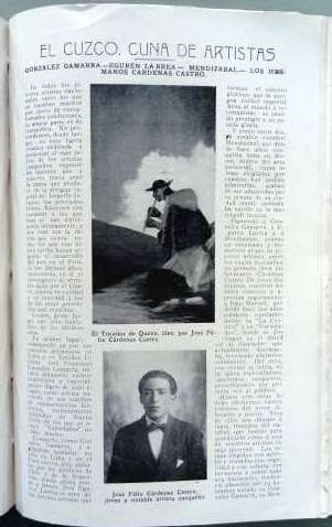 Este extracto del artículo titulado « El Cuzco. Artistas Cuna, González Gamarra – Eguren Larrea – Mendizábal – Cárdenas Castro « , presenta al dibujante, pintor y arquitecto José Félix Cárdenas-Castro (1899-1975), de manera elogiosa, como artista emergente para revelar al público. Este artículo publicado en el número 508 de la revista peruana Variedades, el 24 de noviembre de 1917, destaca a los jóvenes talentos autodidactas, algunos dibujantes y pintores, como lo demuestran las cuatro obras reproducidas en apoyo del artículo. Una primera pintura al óleo, El Tocador de Quena (fig. 1) y tres dibujos, Marena, India hiladora de los alrededores del Cuzco (fig. 2); Pasando a vado en El Río Urubamba (fig. 3); El Correo (fig. 4).