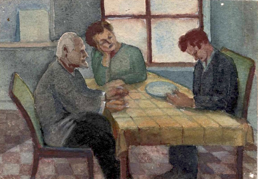«La foto sin anotación en el reverso fue tomada por mi hermana Liliane, mi padre trabajaba hasta altas horas de la noche y para relajarse, dibujaba cuando tenía tiempo, en la mesa de dibujo que él mismo había hecho. Esta foto data de la década de 1950, diré 1954, en cuanto al formato, es tan grande como una postal. » Jean-Paul Cardenas-Castro, Observaciones inéditas (2019)